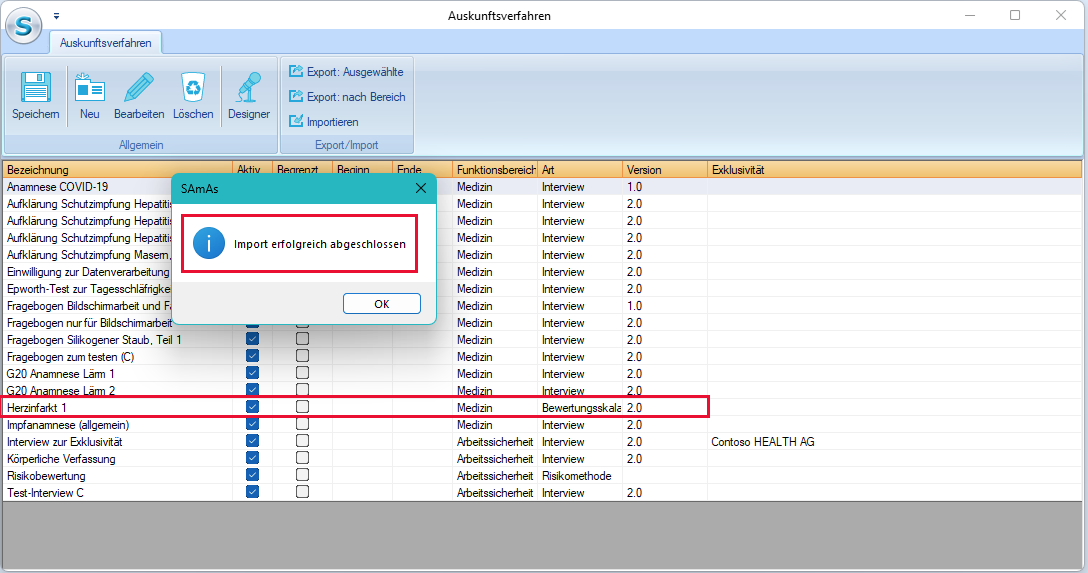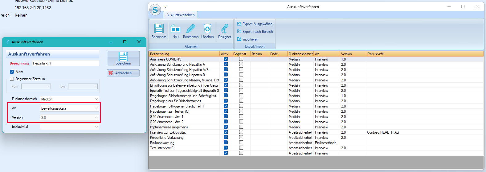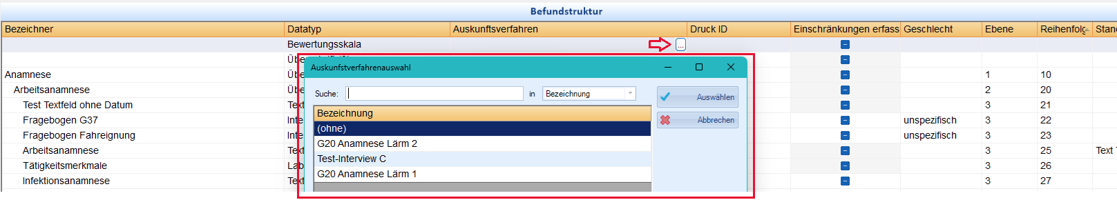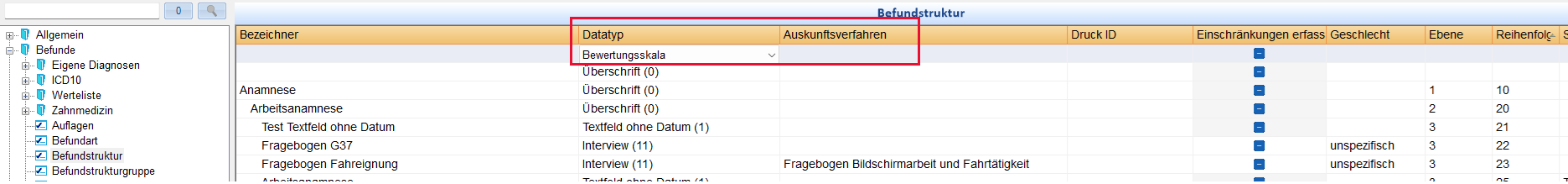 In der Befundstruktur (zu finden unter Daten -> Standardtabellen -> Befunde) wurde die Spalte Datatyp um den Eintrag Bewertungsskala erweitert. Desweiteren wurde die Spalte Interview umbenannt in Auskunftsverfahren.