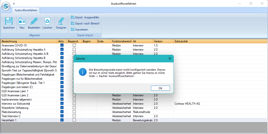 Wird mit Doppelklick auf den Eintrag der Bewertungsskala in der Auflistung geklickt oder über die Schaltfläche Designer, so erscheint eine Meldung, dass die Bewertungsskala nur in sOne Web konfiguriert werden kann: