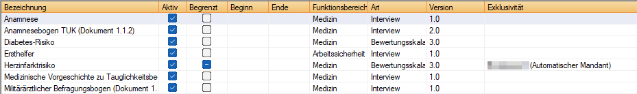 Hinweis: Bei einem Befundstruktureintrag vom Datatyp Bewertungsskala, sind folgende Spalten deaktiviert und können somit nicht genutzt werden: Einschränkungen erfassen; Tabelle; Gerät; Geräteart; Infekt; Auflagen erfassen