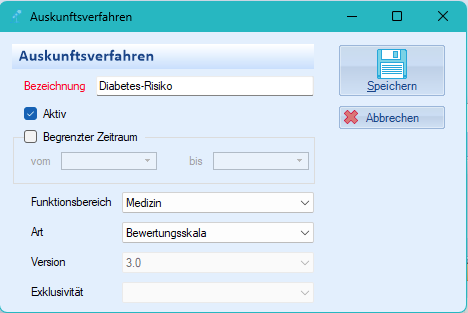 Hier können Sie nun eine neue Bewertungsskala anlegen. Über das Dropdown-Menü im Feld Art kann Bewertungsskala ausgewählt werden. Hier wird automatisch die Version 3.0 gesetzt und die Exklusivität wird deaktiviert.