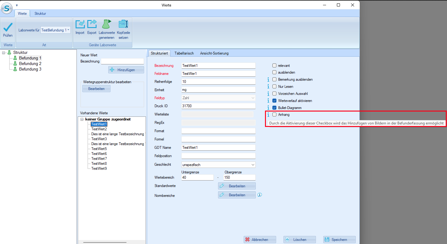 Nur in SAmAs Enterprise Hybrid und SAmAs.one verfügbar.Bei den Laborwerten steht Ihnen nun für jeden einzelnen Wert die neue Option Anhang zur Verfügung.