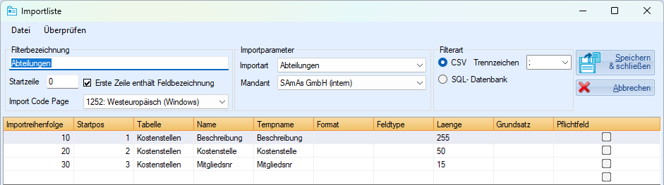 Der Import von Abteilungen erfolgt über die Importart "Abteilungen". Die Abteilungshierachie baut sich auf Basis der Mitgliedsnummer auf. Weitere Details dazu, finden Sie im weiteren Verlauf des Artikels.
