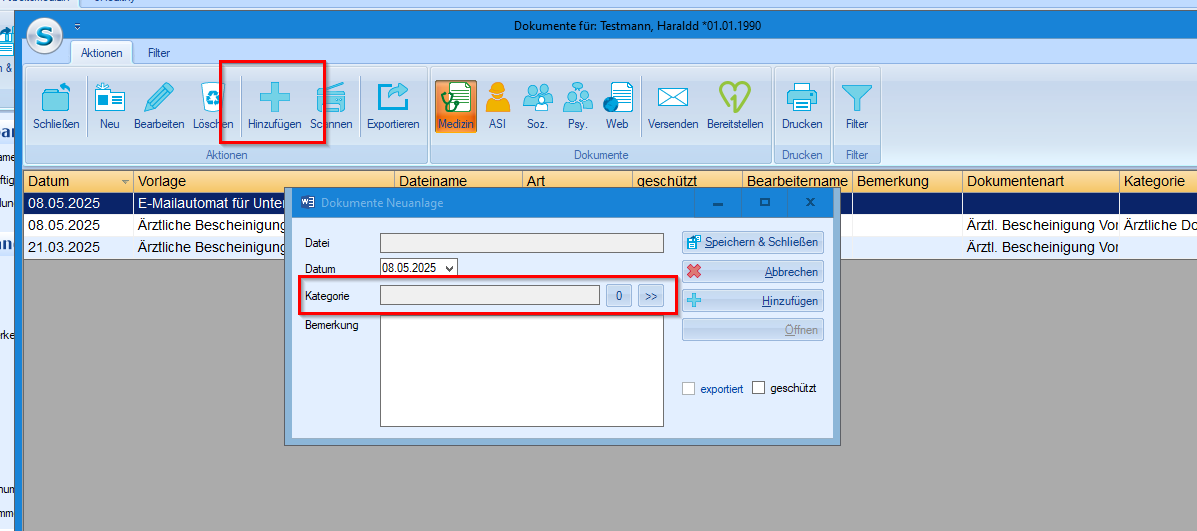 Hinweis: Die verfügbaren Dokumentenkategorien können Sie unter Daten -> Standardtabellen -> Allgemein -> Dokumente -> Kategorien verwalten und hinterlegen.