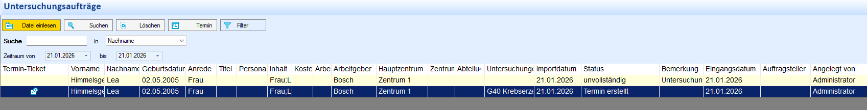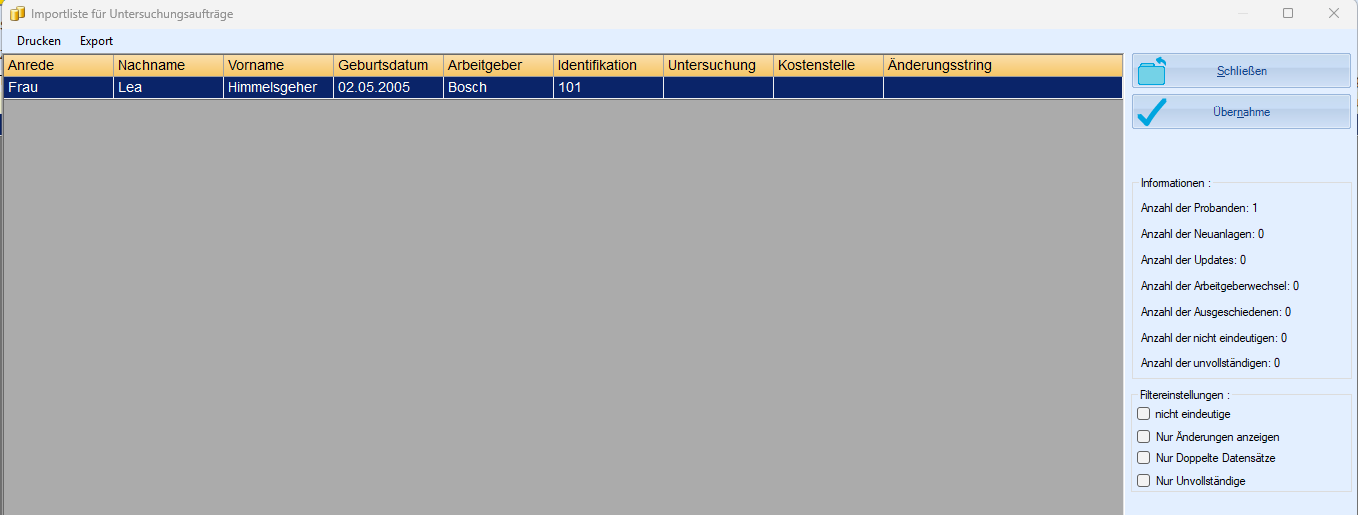 Mit der Importfunktion können Untersuchungsaufträge einschließlich der zugehörigen Personaldaten komfortabel in das System übernommen werden. Dabei ist sowohl die Neuanlage als auch die Aktualisierung bestehender Probanden möglich.