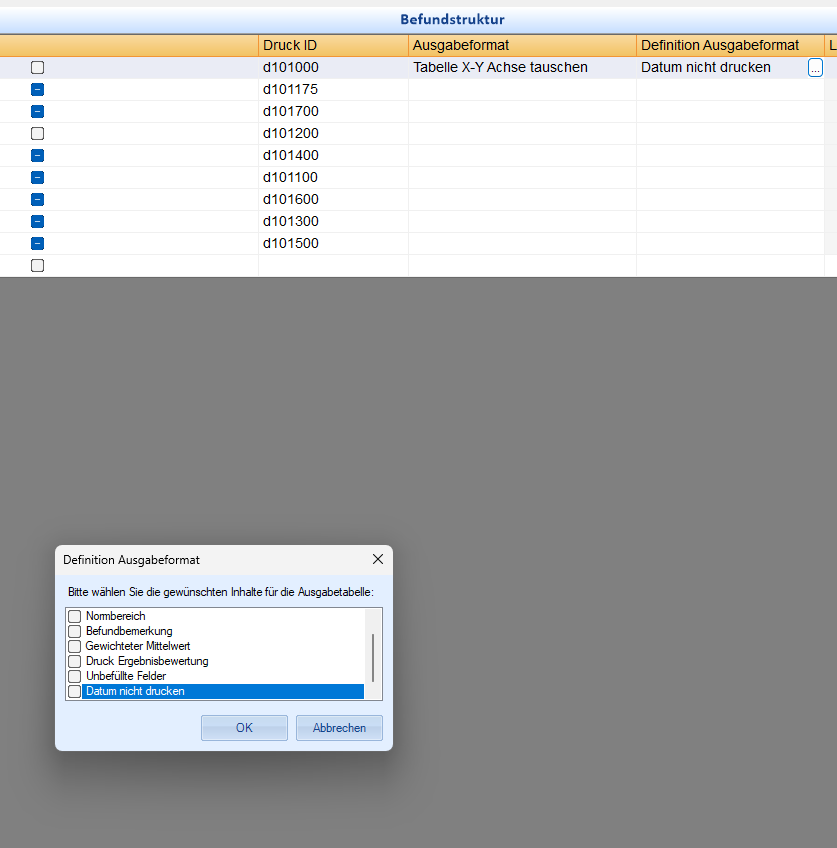 In der Einstellung „Definition Ausgabeformat“ (Daten -> Standardtabellen -> Befunde -> Befundstruktur) steht nun die zusätzliche Option „Datum nicht drucken“ zur Verfügung. Mit dieser Funktion lässt sich flexibel steuern, ob das Datum im Befundbericht angezeigt werden soll.