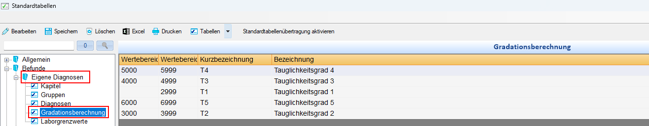 Im Bereich "Eigene Diagnosen" wurde der neue Eintrag "Gradationsberechnung" hinzugefügt. Sie können nun direkt innerhalb Ihrer Diagnosen auf die Gradationsberechnung zugreifen.
