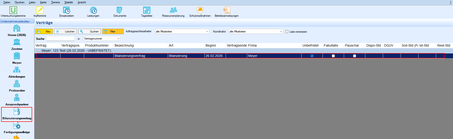 1. Wählen Sie in der seitlichen Menüleiste eine Vertragsposition aus.