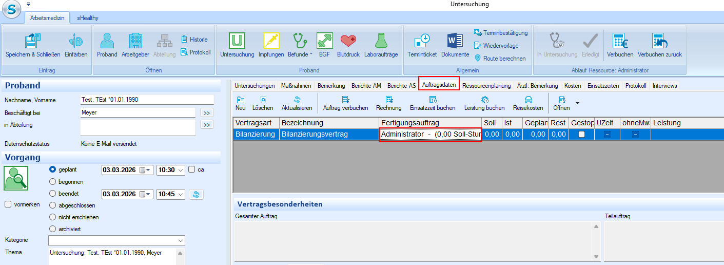 2. Legen Sie anschließend in der Ressourcenplanung einen Termin an. Sofern zur ausgewählten Vertragsposition genau ein Fertigungsauftrag existiert, wird dieser automatisch in der Registerkarte "Auftragsdaten" des neu erstellten Termins hinterlegt.